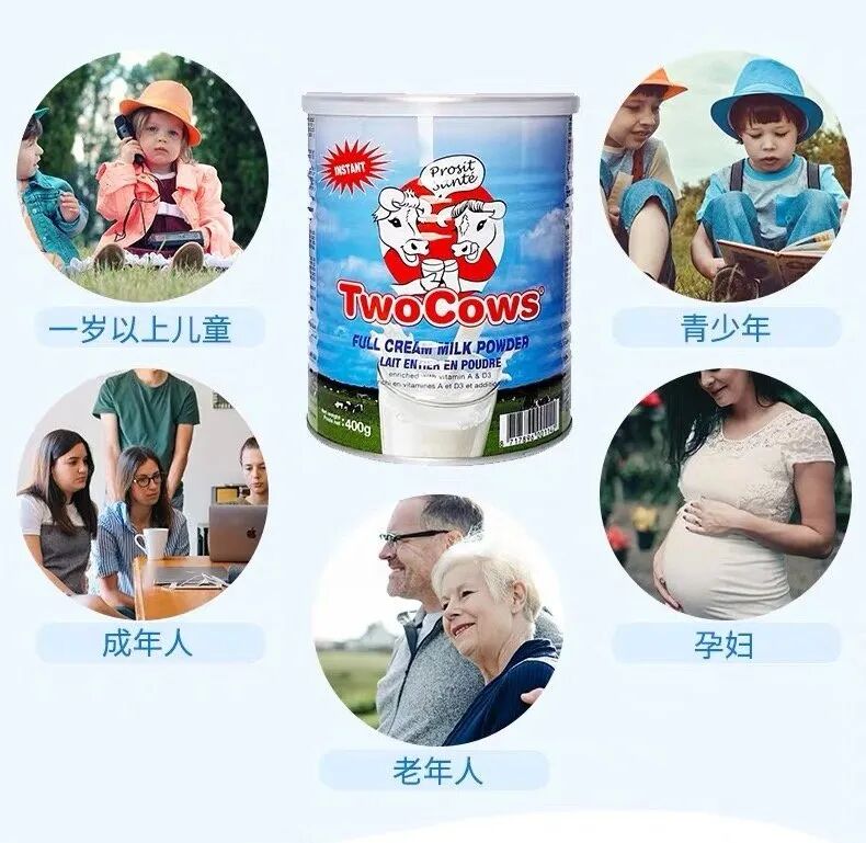 Two Cows淘高斯奶粉由鲜牛奶制成。并加添多种营养成分,提供人体健康所需,含丰富钙质,蛋白质,碳水化合物,维他命及多种矿物质。适合全家人的营养牛奶。