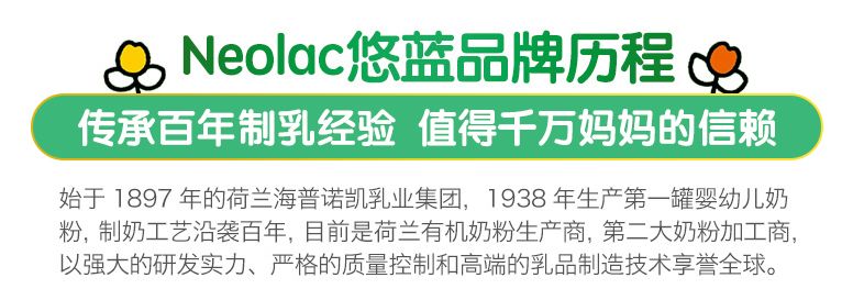 Neolac悠蓝是来自荷兰20多年的高端婴幼儿有机奶粉品牌,臻选荷兰2万多个天然牧场中2%的有机牧场,所有奶牛不使用促进生长的抗生素和激素,不使用奶牛胚胎基因繁殖技术,从饲养到加工保障全线有机品质,通过欧盟和荷兰双重有机认证。