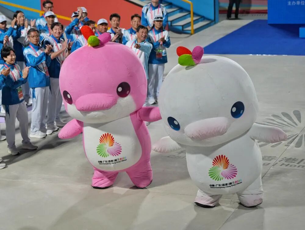 更绝的是设计团队的"小巧思":白色代表海豚安静时的优雅,粉色模拟运动充血时的萌态,头顶三色水柱直接融合了广东木棉红、香港紫荆紫、澳门莲花绿,把"三地联办"刻进了DNA。