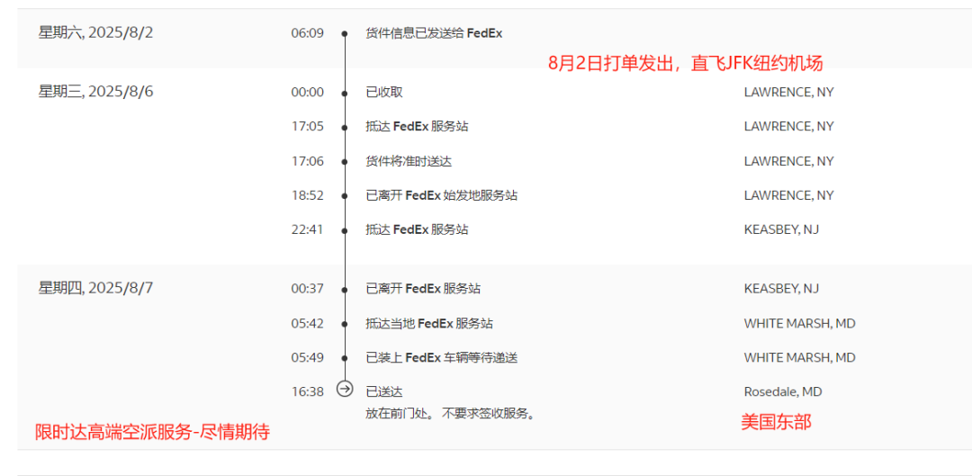 为了彻底解决这一时效瓶颈,我们提前数月精心筹备。2025年8月2日,我们的首班直飞美国东部纽约(JFK)的航班成功启航! 这标志着我们美国空派服务实现重大升级: