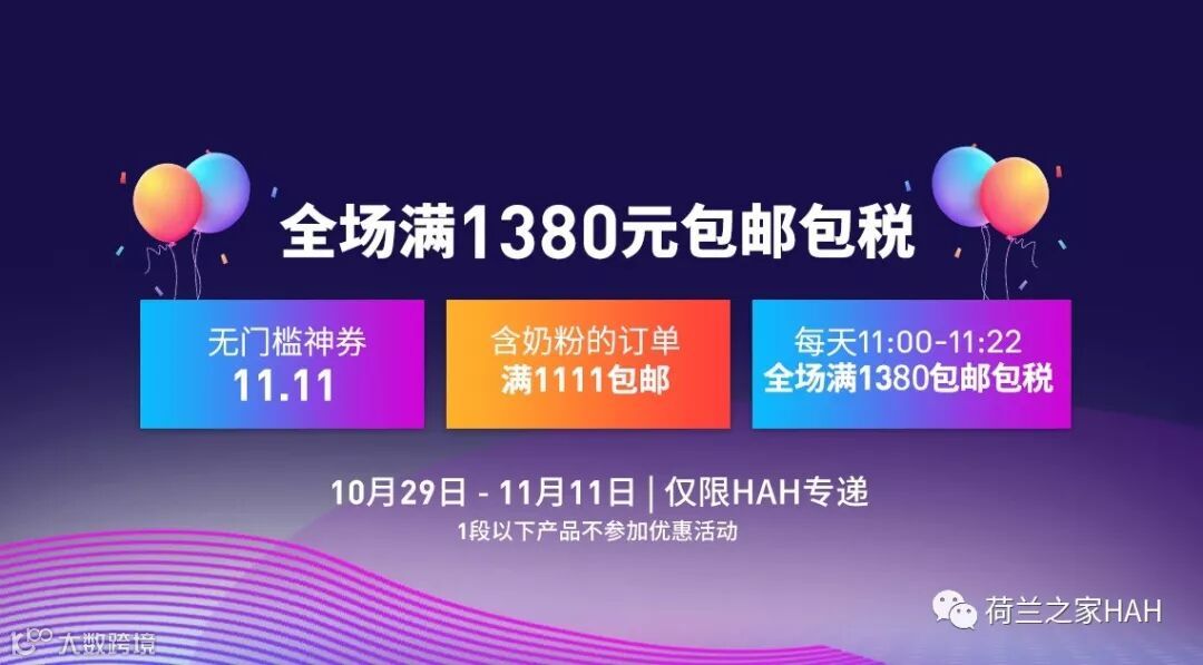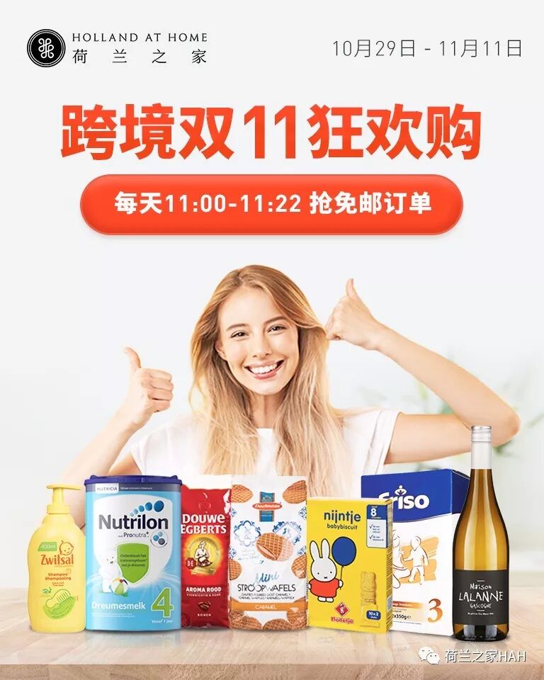 Come on baby,荷兰之家跨境双十一狂欢购物节,10.29~11.11每天上午11:00~11:22,全场满1380限时包邮包税,最高可省680,一年仅此一次,赶快来抢免邮订单吧!