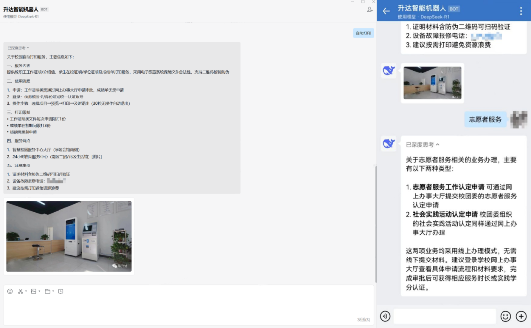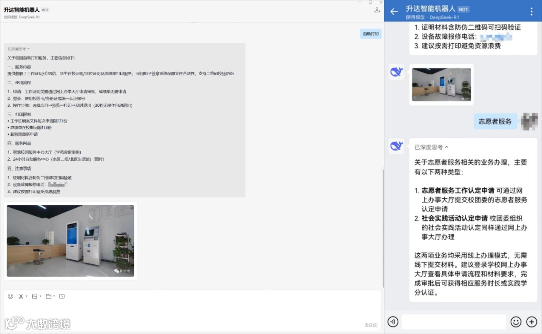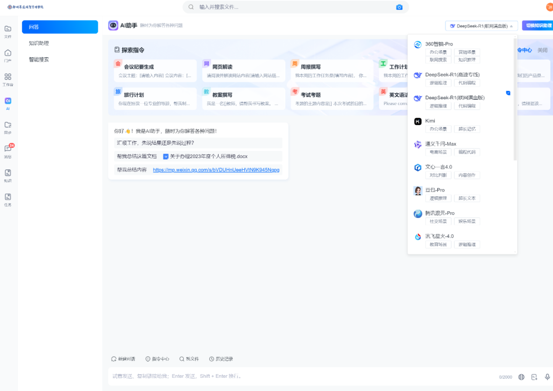 为响应国家教育数字化转型战略,郑州升达经贸管理学院积极推进接入DeepSeek的相关工作,目前已正式上线,同时学校作为CARSI联盟成员接入浙江大学满血版DeepSeek共享其资源服务;移动端基于企业微信通过“智能机器人”为师生提供咨询服务,以虚拟人的角色陪伴师生在校生活、解答各类问题;基于办公网盘接入包括DeepSeek、360智脑、Kimi、豆包、文心一言、通义千问等主流人工智能模型,服务场景更有针对性,全面赋能师生学习、办公场景;通过AI技术的深度应用,学校构建了高效、智能的教育教学生态,为智慧校园建设注入新的动力,未来我们将借助DeepSeek大模型的强大能力,逐步推进服务教学、科研、管理等全场景的智能化升级。