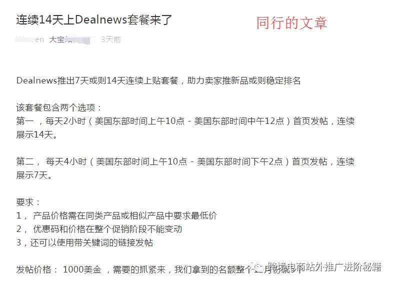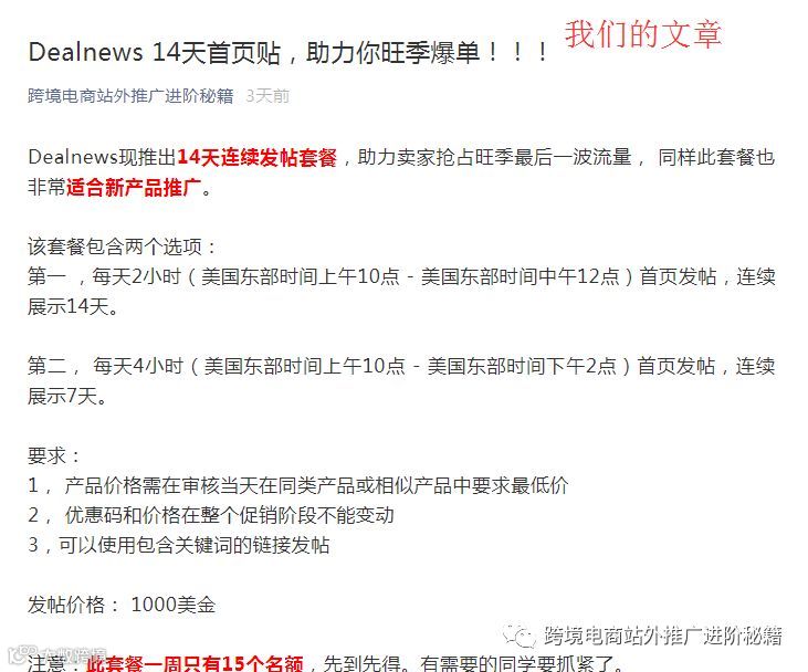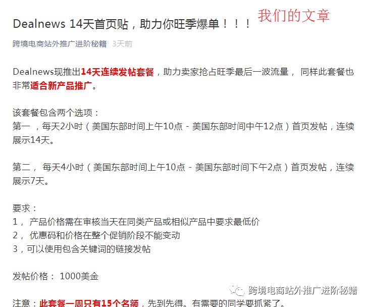 先简单说下事情经过:我们公众号在12月7号17点推送了一篇文章《Dealnews 14天首页贴,助力你旺季爆单!!!》。本来是一件很平常的事情。但是不平常的是紧接着的18点就有一个同行的公众号推送了一篇类似的文章。其中部分内容与我们所写内容完全一致。有这两个公众号的同学也可以自行对比。