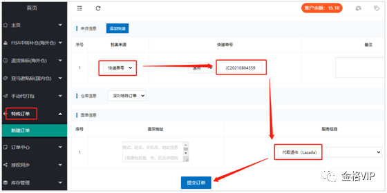 填写退件单号,服务信息下拉选择代取退件(Lazada),点击【提交订单】。