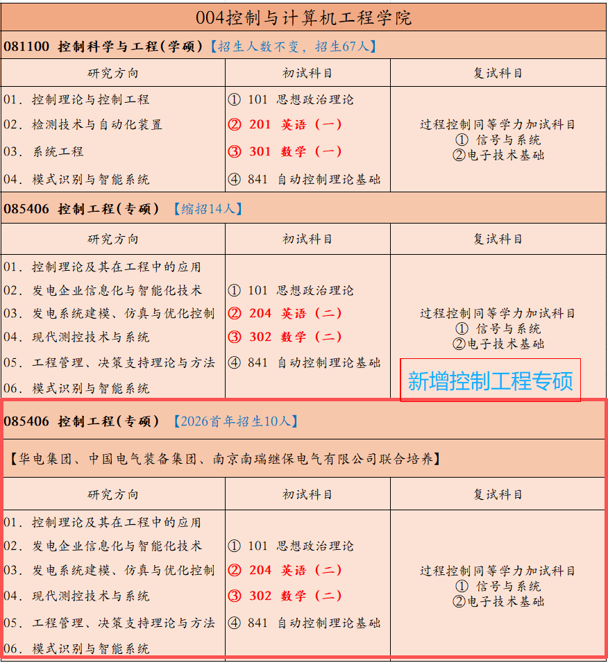 新增控制工程(专硕):2026招生10人,该计划与华电集团、中国电气装备集团、南京南瑞继保电气有限公司联合培养。