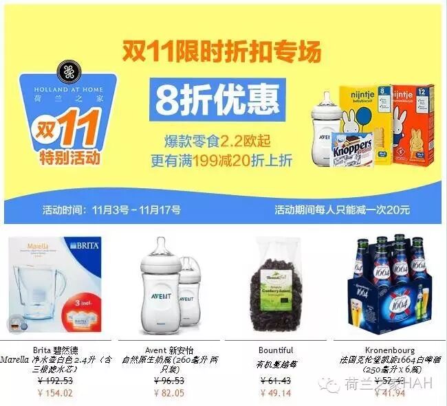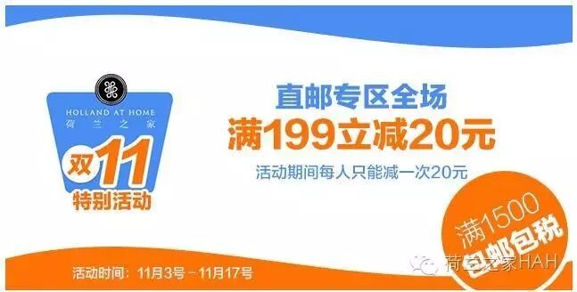 活动详情:11月3日-17日期间,荷兰之家特惠折扣活动,全场满199元减20(每人只能减一次哦),折扣专场享8折优惠,更有免邮专区,购买1-2件产品即可免邮!85折包税区特惠,满333元包邮,还不快来战?