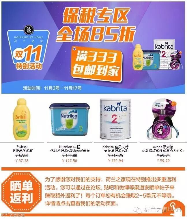 小伙伴们,双十一快到啦,你的购物车是不是正在等待清空呢?荷兰之家双十一让你提前享优惠,无需长久等待,阳光清关,HAH专递6-10天到货,超级特惠享不停!