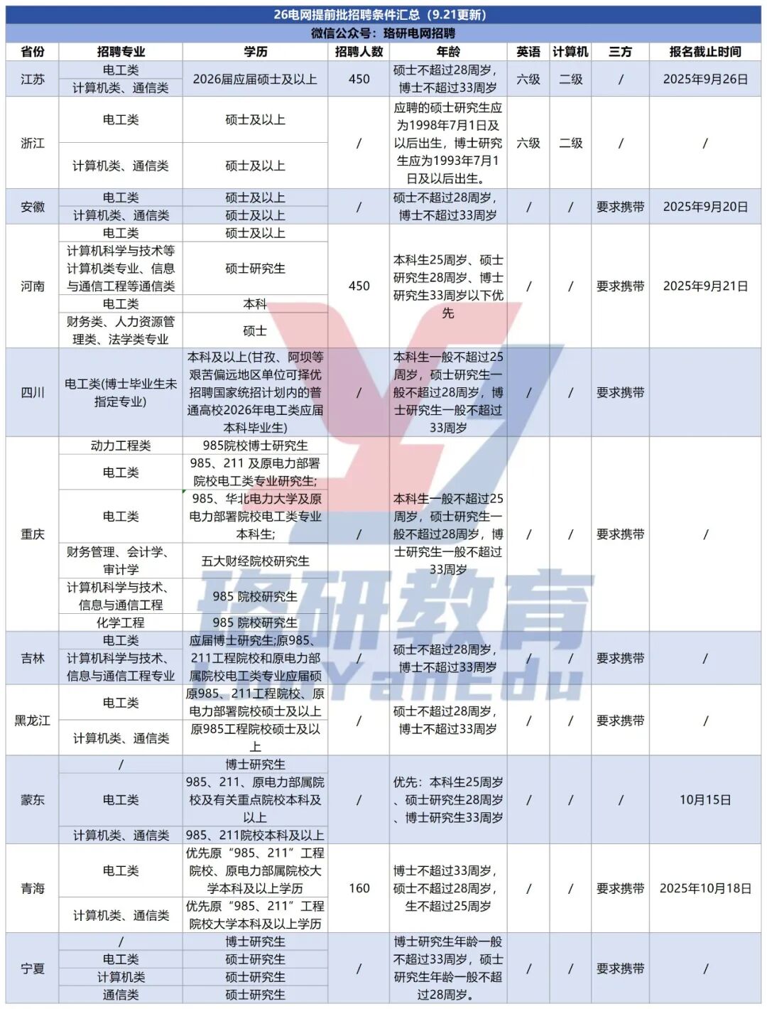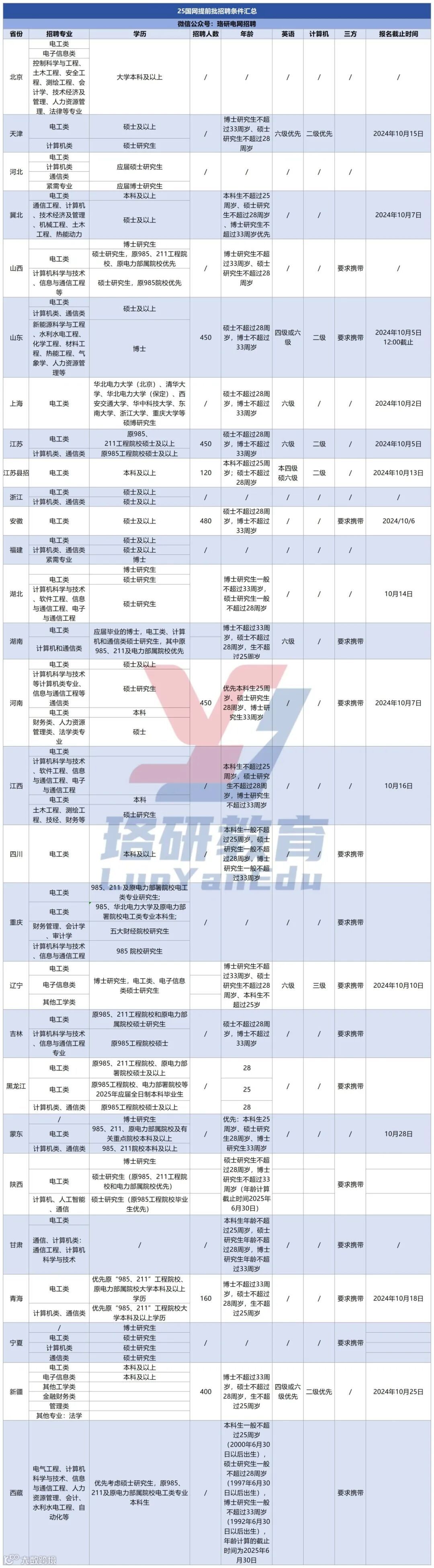 由于部分省份还没有公布招聘要求,珞研电网招聘LY也把25届电网提前批招聘要求汇总如下,供大家参考!👇
