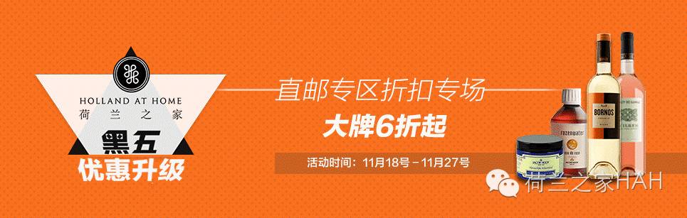 【活动时间】:2016年11月18日-11月27日 【活动内容】:荷兰之家新款上市,多款欧洲精品葡萄酒买5送1,包邮包税!6瓶只要495元!天然护肤 JacobHooy 雅歌布6折起! 更有爆款大牌,母婴品牌Avent新安怡全线产品,Brita碧然德全线产品,Delirium比利时粉象啤酒,Kronenbourg啤酒,Knoppers巧克力威化,Avène雅漾修护霜以及Bountiful蔓越莓8折起,优惠不断! 额外优惠,即日起至11月27日,凡关注荷兰之家微信公众号的新客户可领取5欧优惠券,关注荷兰之家微博账号可参与转发抽奖活动,免费选取幸运用户赠送6瓶欧洲经典红酒,直邮到家,快来参加吧!