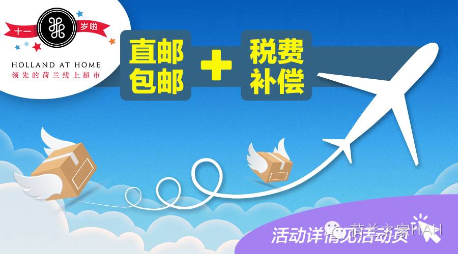 2016年6月7日到2016年6月13日之间,直邮专区订单满888元(不含运费)即可享受包邮优惠(包裹限重10kg以内)。并且,活动期间每一个货值(含运费)少于1000元的包裹,如果到达中国海关的时候被税,请将您交税的证据(税单)拍 照,并且结合其他能够证明此单是在活动期间下单的信息发送给客服邮箱(china@holland-at-home.com). 我们会为在活动期间下单,被税的包裹,补偿全部海关税费,我们会将补偿的税费以店铺信用点数的形式存入您的荷兰之家账户,点数可以直接在下次下单的时候使用。