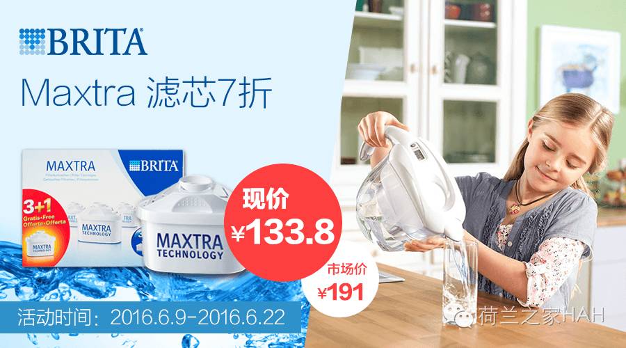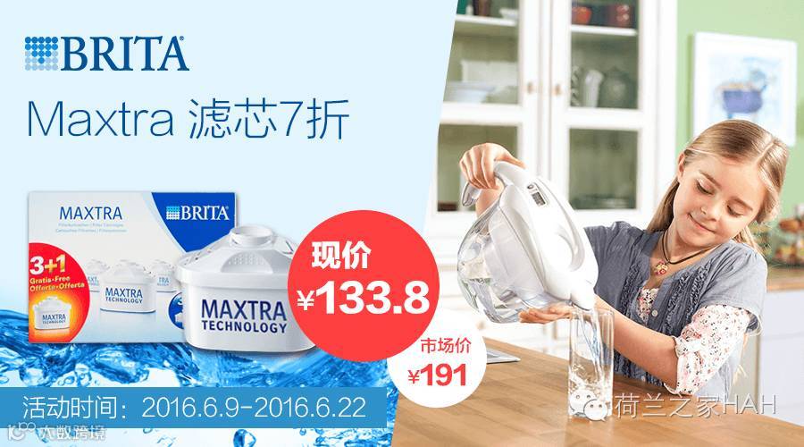 Brita 碧然德 净水过滤芯 3+1 Brita过滤产品能有效净化水质。它能去除重金属例如铅和水中的石灰和氯。让水质纯净。这款滤芯能确保为您去除您的家用饮水设备中的水垢。原价191元,现价133.8元(相当于每个滤芯只要33元) (2016.6.9 - 2016.6.22)