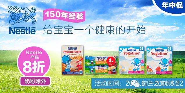 宝宝在成长过程中需要非常多的营养,从宝宝6个月开始母乳就已经不足以保证宝宝的营养需求了,一定要适当给宝宝添加辅食。在宝宝小时候建立良好健康的饮食习惯有助于为宝宝长大后的健康生活打下良好基础。Nestle雀巢是世界上最大的食品生产商和健康营养领域的市场领导者。Nestle雀巢已经有150年研制婴幼儿食品的经验,致力于给宝宝一个最好的开始。现在Nestle食品(奶粉除外)8折(2016.6.9 - 2016.6.22)
