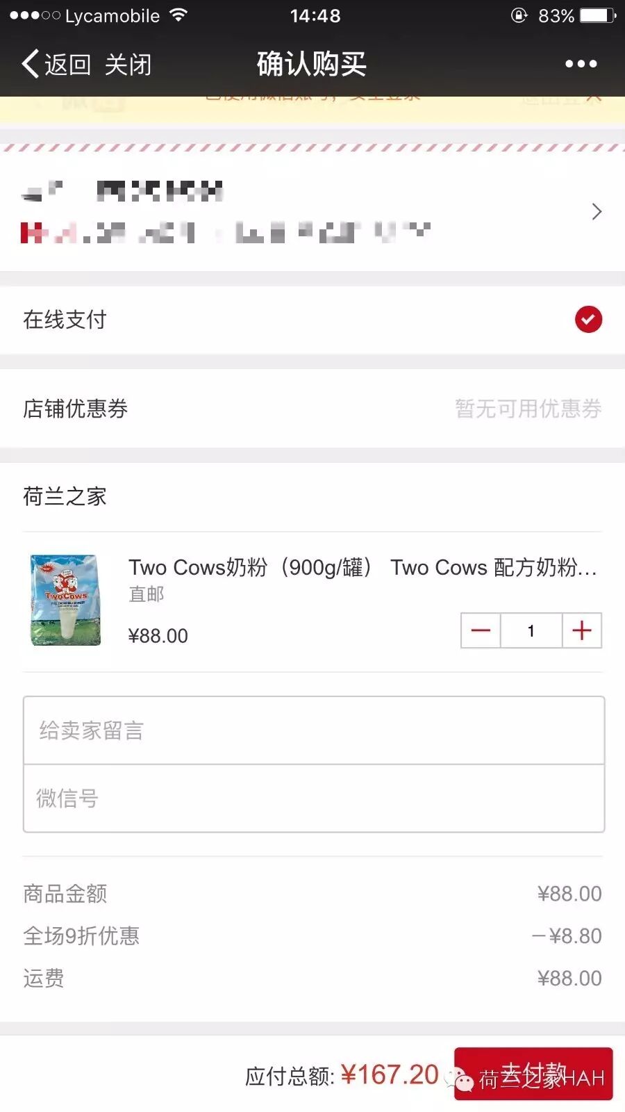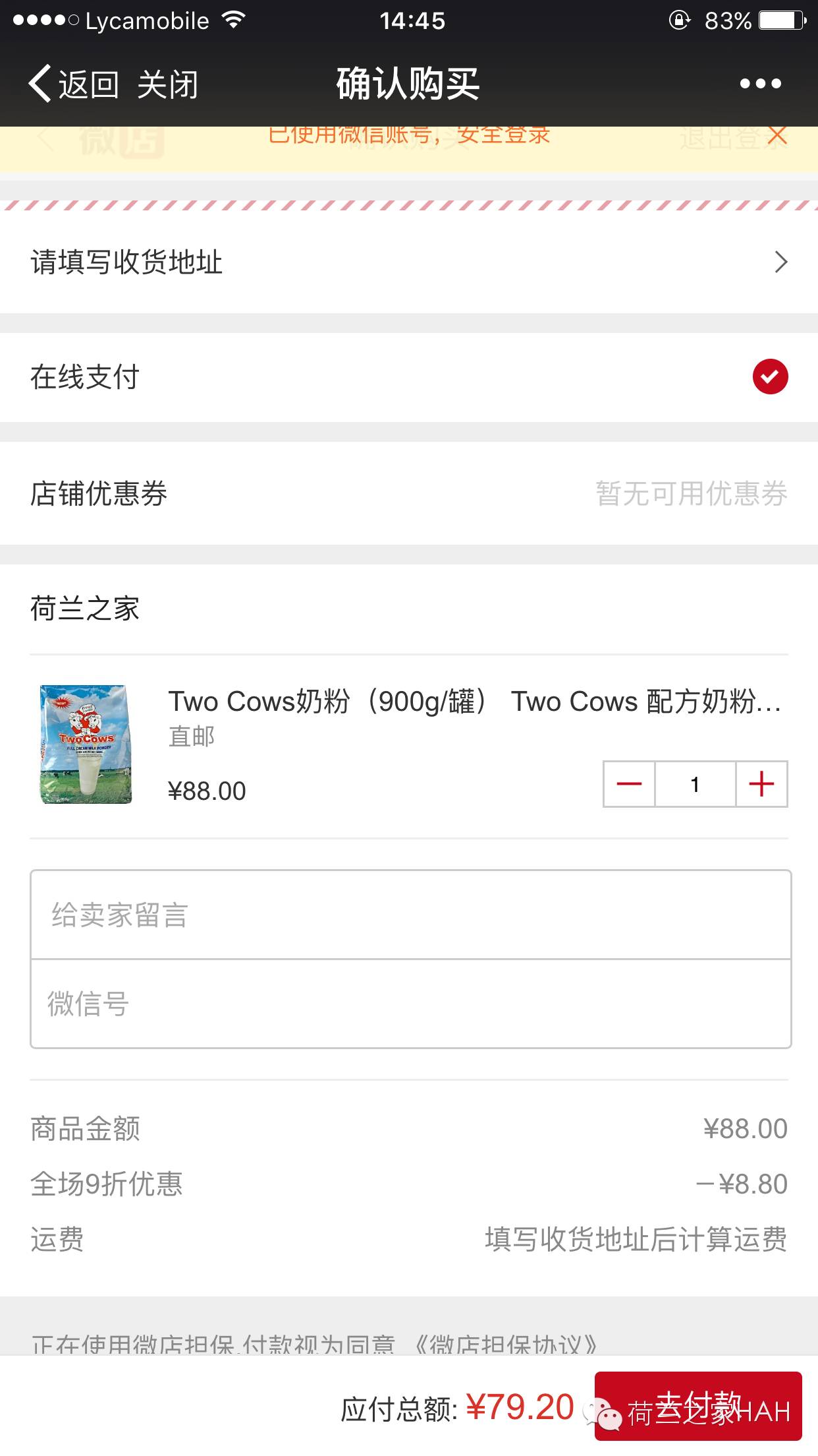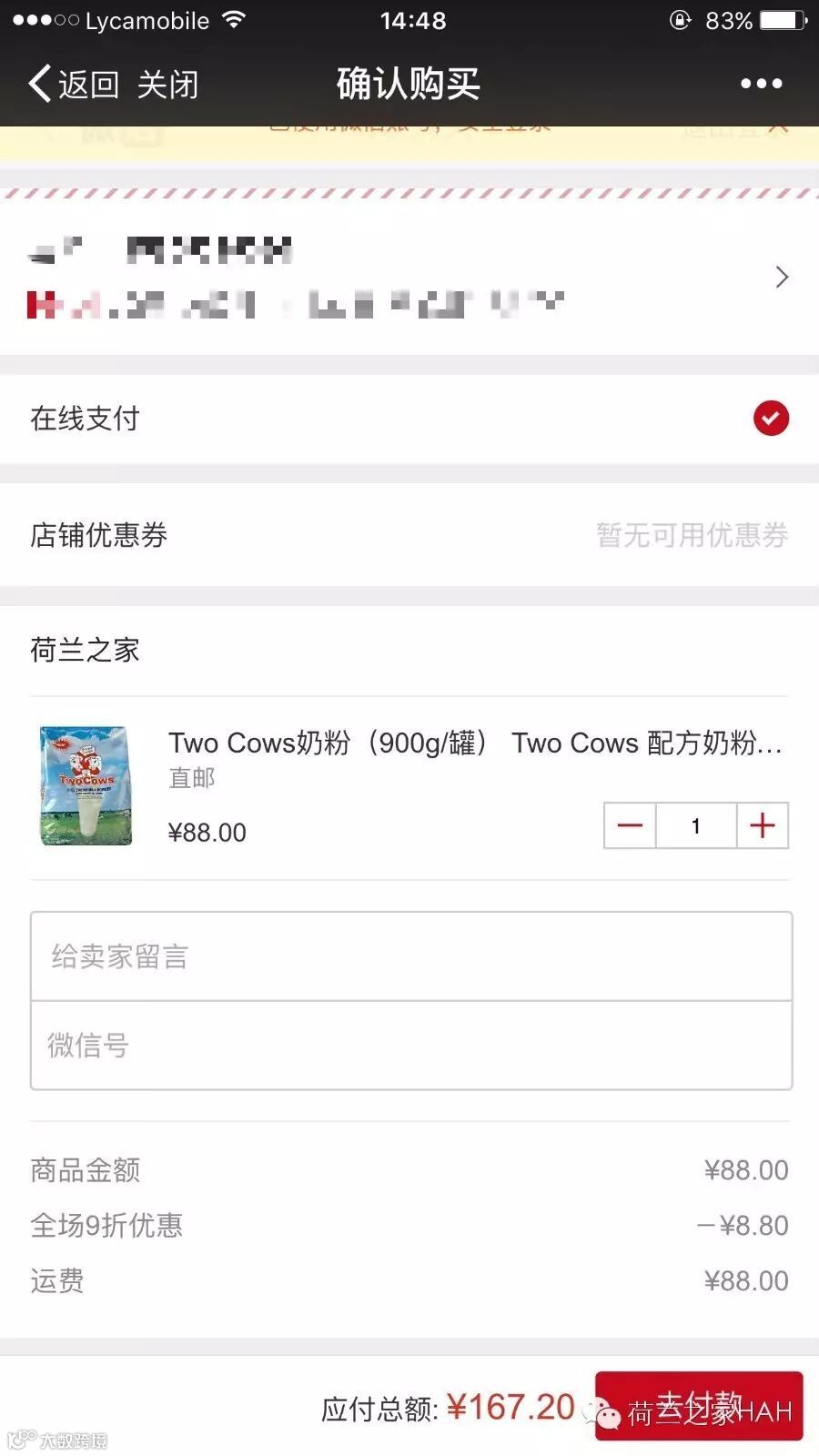 请仔细核查自己订购的产品名,规格,以及数量是否正确,应付总额会出现在页面右下角(优惠价格也会显示出来哦~)。如果您有信息想发送给我们,您也可以选择“给卖家留言”并留下微信号,我们就可以收到您的信息了。信息确认无误后,您就可以点击“去付款”。