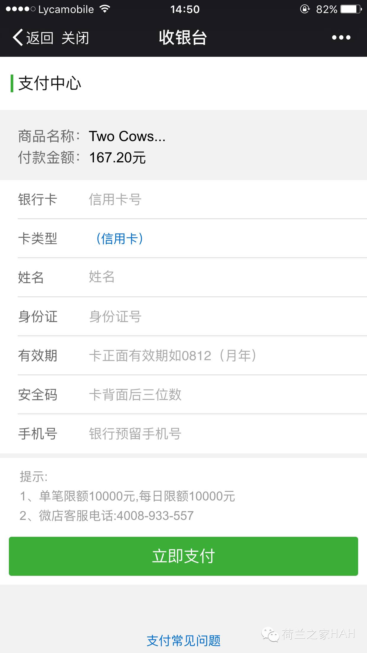 页面跳转后,请填写相关的信息,并检查核实信息是否正确无误。最后点击“立即支付”就愉快地完成一笔订单啦!您可以进入“订单中心”查看订单信息。