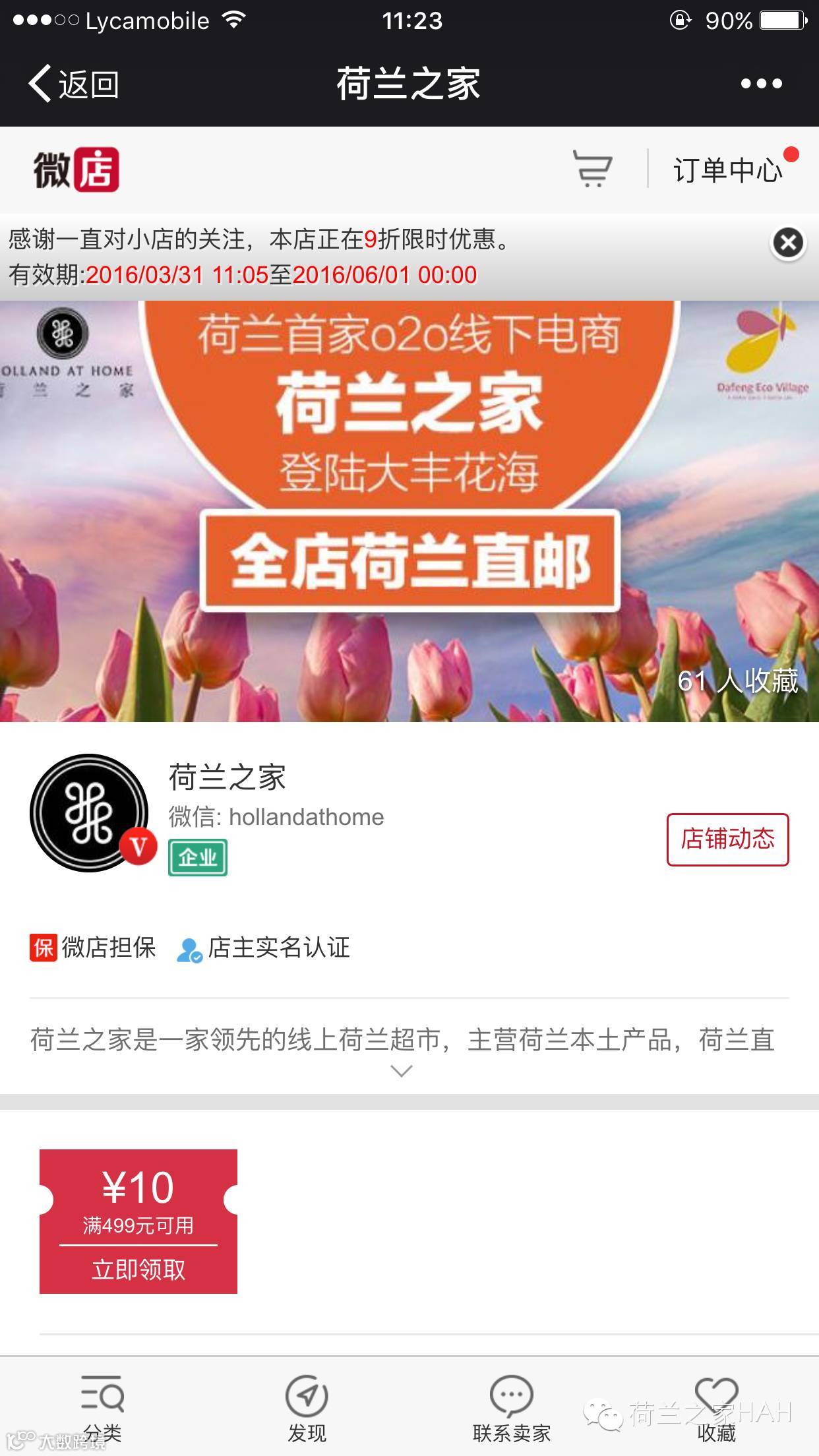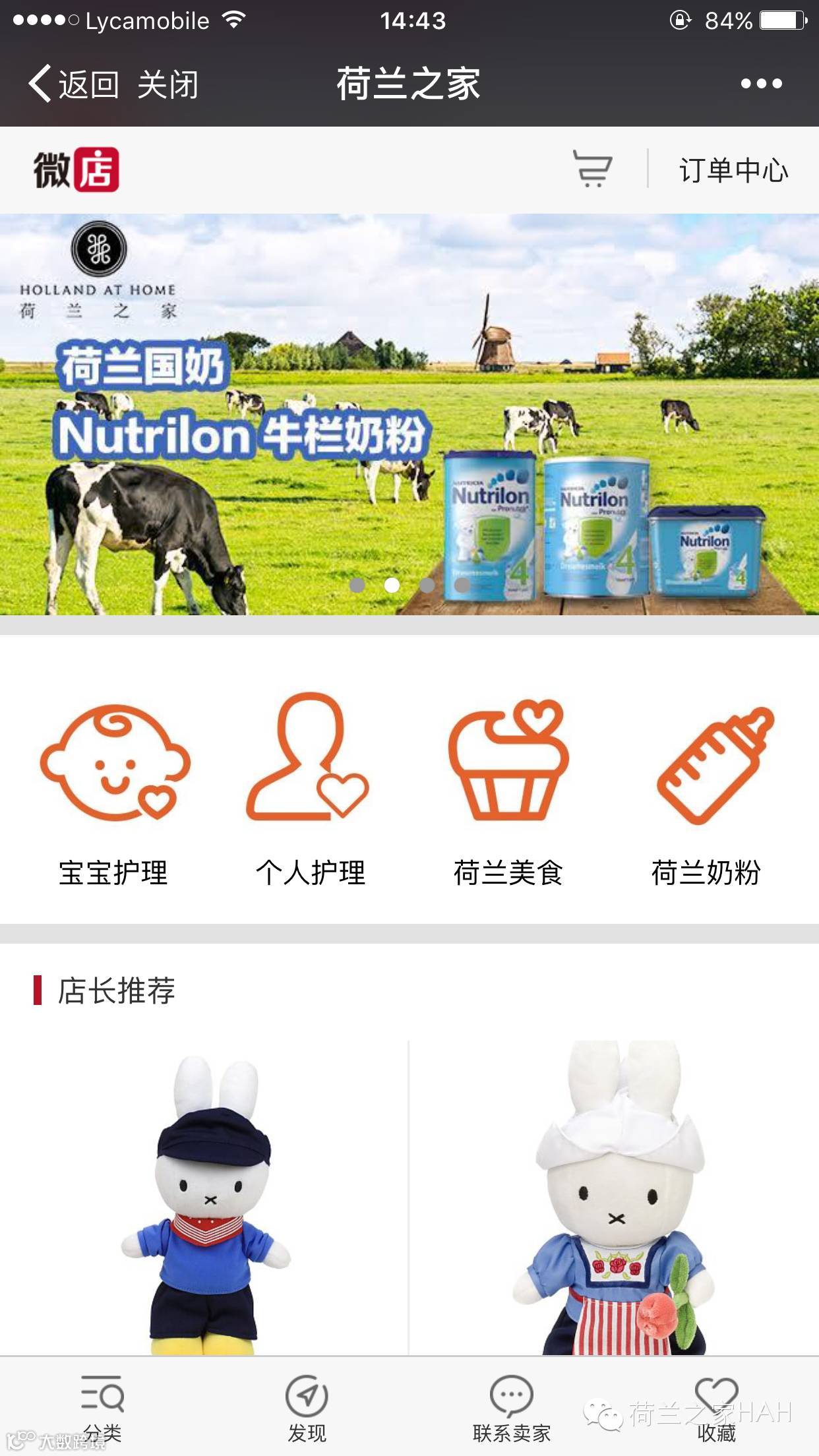 在页面下方您还可以看到四个选项:分类,发现,联系卖家,收藏。如果您喜欢荷兰之家的微店,请记得要大胆的选择收藏哦~