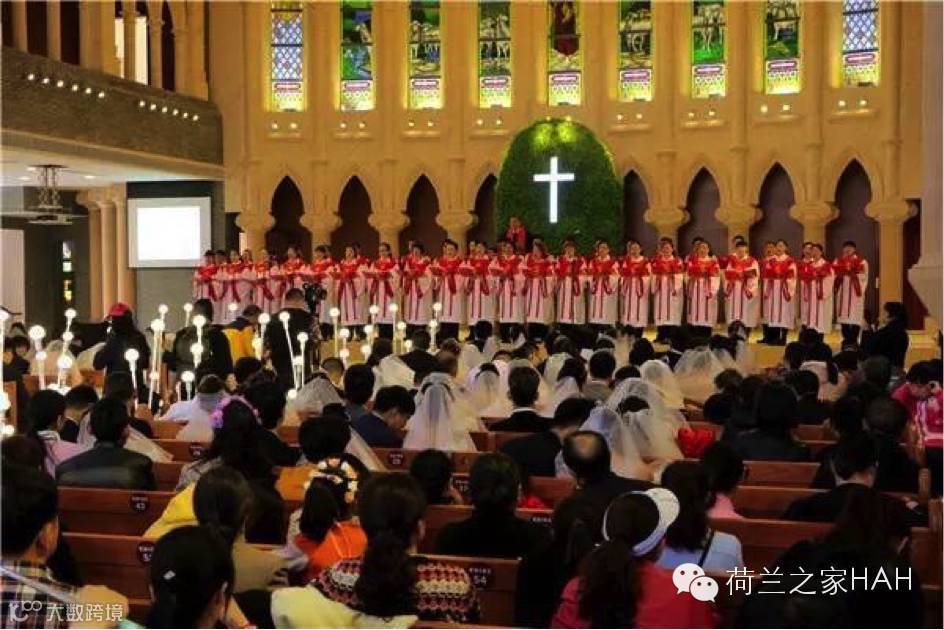 (图为荷兰花海欧式教堂中的集体婚礼现场,唱诗班为新人们送上神圣祝福)
