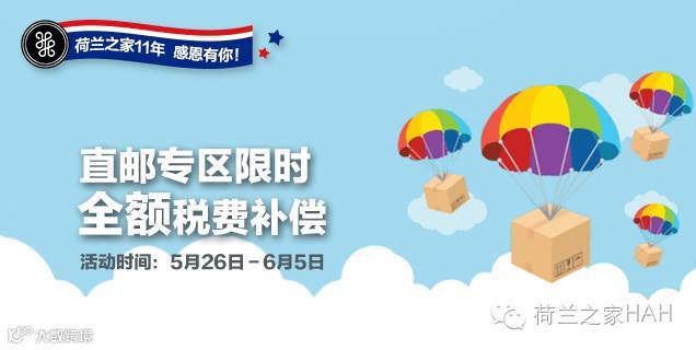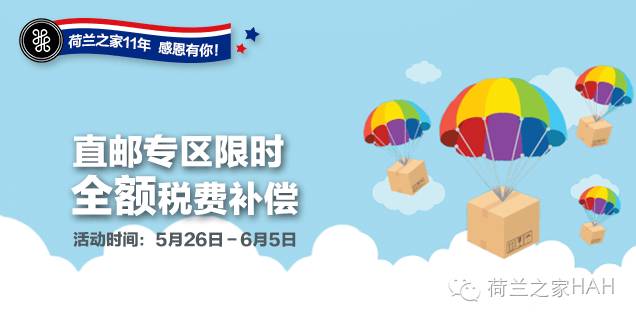 凡在5月26日-6月5日期间下单的客户,如果您的包裹在到达中国海关的时候被税,请将您交税的证据(税单)拍照,并且结合其他能够证明此单是在活动期间下单的信息发送给客服邮箱(china@holland-at-home.com). 我们会为在活动期间下单,被税的包裹进行补偿全部海关税费,我们会将补偿的税费以店铺信用点数的形式存入您的荷兰之家账户,点数可以直接在下次下单的时候使用。