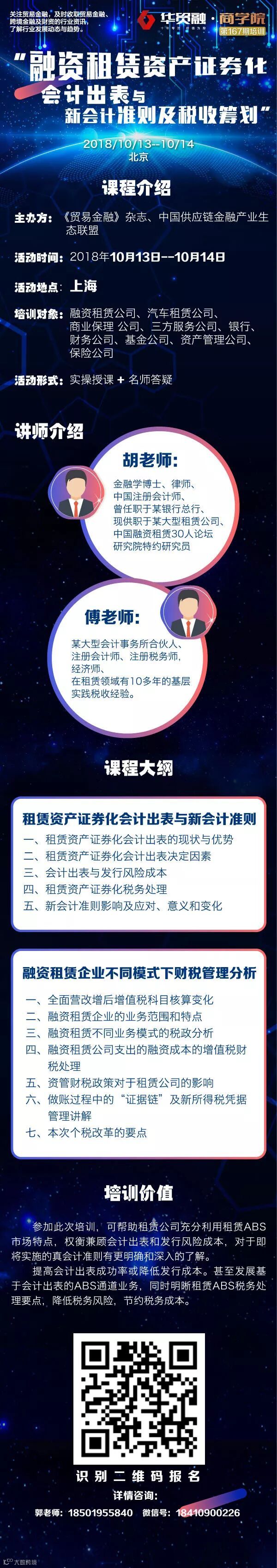 参加此次培训,可帮助租赁公司充分利用租赁ABS市场特点,权衡兼顾会计出表和发行风险成本,对于即将实施的真会计准则有更明确和深入的了解。提高会计出表成功率或降低发行成本。甚至发展基于会计出表的ABS通道业务,同时明晰租赁ABS税务处理要点,降低税务风险,节约税务成本。