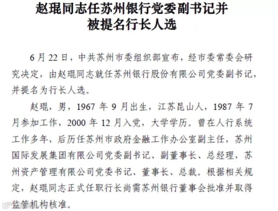 刚刚,券商中国记者从苏州银行方面获悉,6月22日,中共苏州市委组织部宣布,经市委常委会研究决定,由赵琨同志就任苏州银行股份有限公司党委副书记,并提名为行长人选。