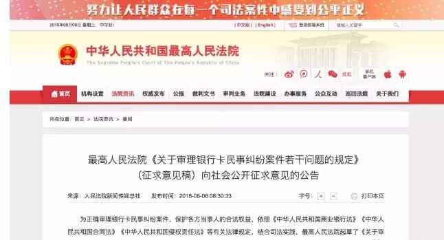 最高法公告表示,为正确审理银行卡民事纠纷案件,保护各方当事人的合法权益,依照《中华人民共和国商业银行法》《中华人民共和国合同法》《中华人民共和国侵权责任法》等有关法律规定,结合司法实践,最高人民法院起草了《关于审理银行卡民事纠纷案件若干问题的规定》(征求意见稿)。为进一步完善该司法解释,更好地保护当事人的合法权益,现通过最高人民法院官网、中国法院网等向社会公开征求意见。