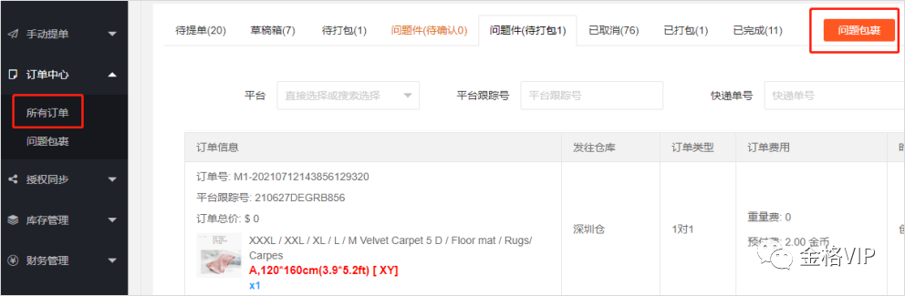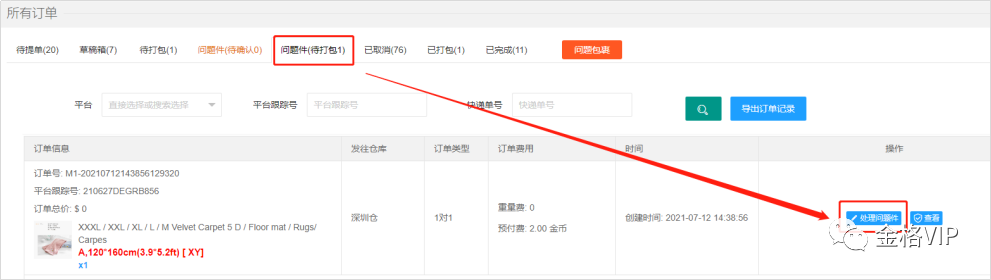 下图为金格VIP代打包订单处理流程。问题件分2类:待提单问题件、待确认问题件,需要您及时配合处理。