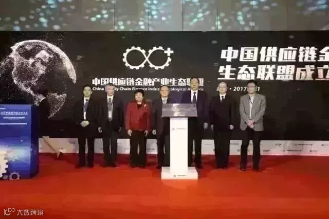 在4月21日举行的“2017中国供应链金融年会”上。主办方中国贸易金融网、贸易金融杂志和中国交易银行50人论坛联合多家机构发起成立了酝酿许久的“中国供应链金融产业生态联盟”,并举行了揭牌仪式。商务部原副部长魏建国、中国交易银行50人论坛主席张燕玲、中国中小企业协会会长张竞强、浦发银行总行公司业务管理部总经理杨斌、社科院金融所银行研究室主任曾刚、海尔集团供应链金融总监杨红星、中国贸易金融网总编辑张志强等业内大咖一起上台为中国供应链金融产业生态联盟举行了揭牌仪式。
