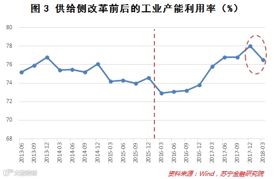 整体上看,我国目前产能利用仍未达到80%,去产能进程仍在继续。并且,2018年第一季度的去产能有所反复,依然面临严峻挑战,也反映了企业面对限产政策的反弹动机。