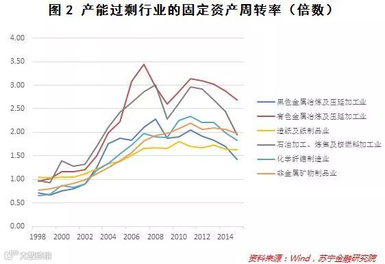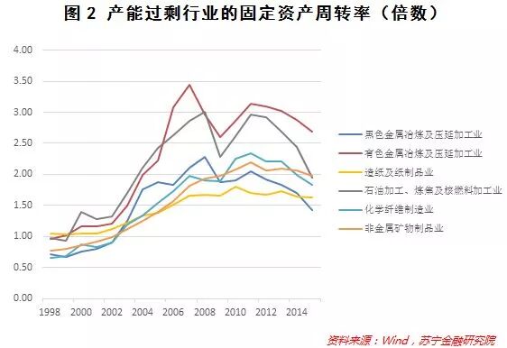 再来看产能过剩行业的固定资产周转率变化趋势(参见图2)。2000年以来,相关行业的资产周转率持续提高,直到2008年国际金融危机爆发后开始下滑,但2009年后又开启了持续约4年的升高,其背后是政府“四万亿”投资刺激。2013年以后,该指标又持续下滑,直到2015年下半年产能过剩问题爆发。