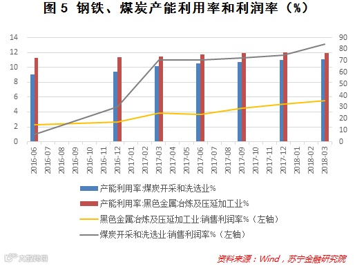 从当前效果来看,得益于前期固定资产投资调整得当,煤炭去产能的效果似乎更好一些,煤炭产业的利润率爬升更明显(参见图5),但业界很多观点认为,其去产能预计要延续至2020年之后。