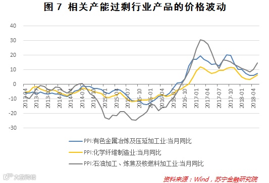 因此,除了部分石油化工子行业以外,其他传统意义上产能过剩行业的去产能效果尚佳。不过,需要注意的是,进入2018年以后,诸多产业的产量反弹明显,价格形成了波动中下降趋势(参见图7),因而投资者需要持续关注相关企业在政策放松情况下的产能反弹。