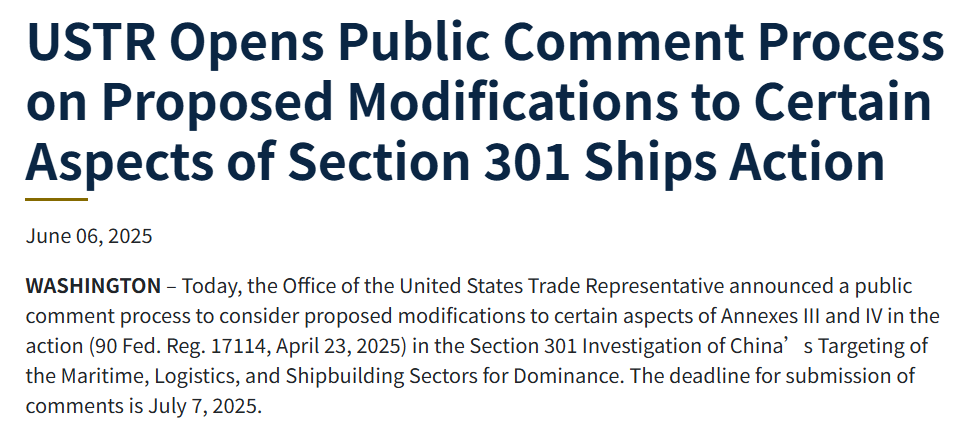 美东时间6月6日晚,美国贸易代表办公室(USTR)发布公告,就拟议修改针对中国在海事、物流和造船领域主导地位的301调查行动发起公众征求意见。此次征求意见距离2025年4月17日决定实施301调查行动不久,主要针对附件III(汽车运输船收费)和附件IV(LNG运输限制)提出具体修改建议。征求意见见征询截止日期为2025年7月7日。
