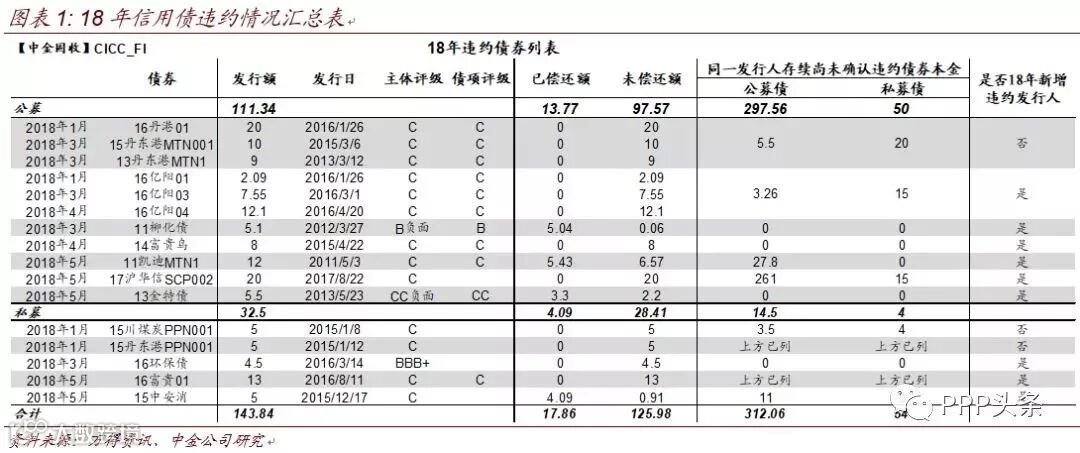但18年以来违约频率有明显加快的势头。从新增违约发行人数量看,14年有且仅有超日债一单违约,15和16年违约数量逐步增多,新增违约发行人分别为8个和16个。17年由于产能过剩行业盈利和融资环境好转,加上19大前后市场维稳压力较大,新增违约发行人数量降低至6个。而18年截至目前,新增的违约发行人已经有8个,超过了17年6个的全年总量,而且简单年化也已经达到了16年16个新增违约发行人的历史高点。另外由于刚刚违约的华信涉及存量债296亿元,违约涉及的债券数量从17年底的900亿,增加到了目前的1378亿。如果再考虑到已经明显涉及负面新闻,虽然近期努力兑付了到期债券,但还有大量存量债券面临再融资压力的盾安(存量债券一百亿左右)等主体,实际暴露风险的债券数量还会更多。