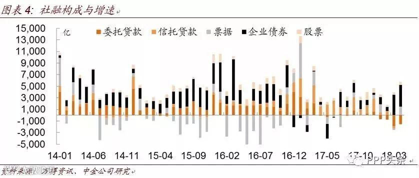 但我们需要防范融资渠道快速收缩引发连锁反应,核心是如何解决“融资渠道缺口”问题。简单测算,如果今年要支撑今年经济增速达到目标,社融增速至少要维持在10-12%的增长,对应17.5~21万亿的社融增长。但非标和委托贷款融资无疑会出现不小幅度的压缩。其中,假设理财规模今年出现萎缩,非标出现万亿级别的缩量较为正常。委托贷款目前存量高达13.5万亿,今年也存在小幅压缩可能。而股票融资增长今年压力较大,信托贷款增量有限,债券市场融资今年前四个月略有恢复,但近期受到信用事件冲击明显弱化,如此推算,信贷额度显然应该给予较大幅度的松动,才能弥补融资渠道缺口。去年人民币贷款新增13.5万亿,今年前4个月较去年同期新增3600亿元,从全年来看,这一新增幅度仍明显不够。如果不能顺利开正门,社融增速很可能在未来一段时间快速下行。从我们微观调研的情况来看,大行普遍存在贷款积压的情况,显示出信贷需求也没有得到充分满足。如果这种情况继续,社融增速很可能在未来一段时间快速下行。