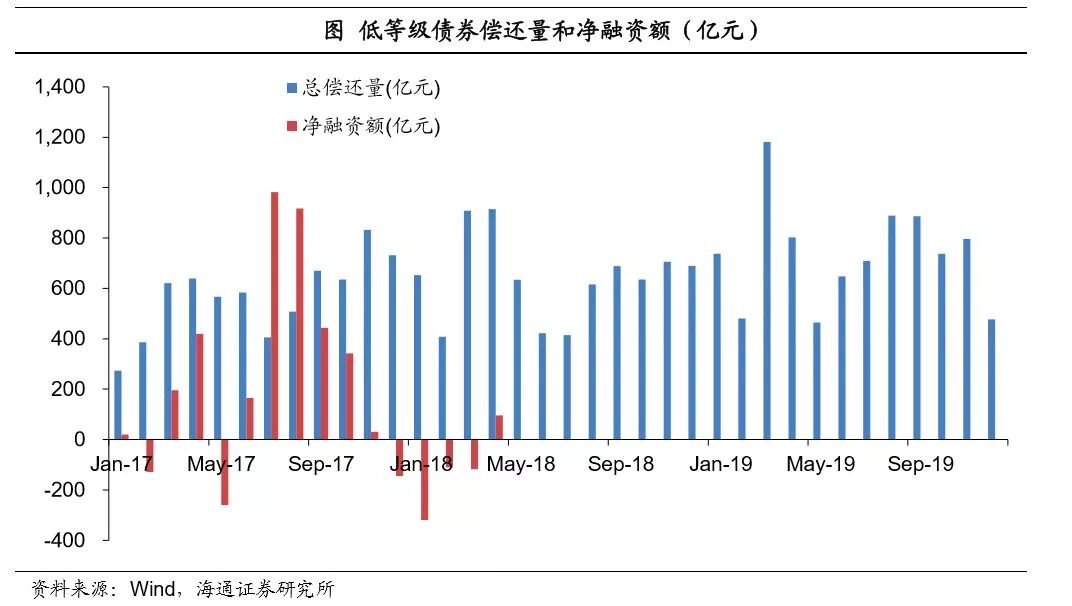 本轮违约潮的主要驱动因素为再融资压力的增大,违约潮退去需要看到融资渠道的重新放宽。非标方面,资管新规已经实施,虽然给了银行理财2年半的缓冲期,但打破刚兑、禁止投非标产品的原则没有变化。且据新浪财经报道,针对资管新规,监管层建议未来三年每年压缩整改三分之一。这意味着即便是银行理财的存量规模在未来3年内仍存在萎缩压力。债券方面,资金表外转表内、资管产品净值型转型均伴随着对信用风险容忍度的下降,净融资很难大幅上升,表内贷款亦受资本金、行业政策、风险偏好等制约,除非有进一步政策支持,短期内或难以弥补再融资缺口。而从低等级债券(主体评级AA-及以下,剔除短融和超短融)到期量来看,3月和4月高峰过后有所回落,但8月起将再度上升且持续较高,兑付仍将面临考验,违约潮或未完待续。