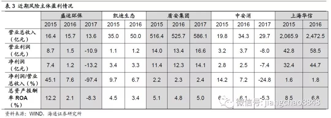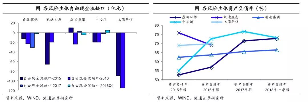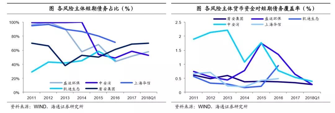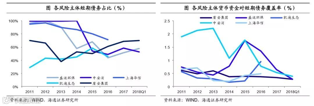 近期出现风险事件的有关主体,普遍有着较大的投资支出压力,同时经营活动现金流难以满足其投资需求,因此公司对筹资活动有非常高的依赖。但债务结构又不合理,多以短债为主,比如2017年底盾安集团、中安消、盛运环保的有息负债中,短期有息负债占比均超过了50%,其中盾安集团甚至接近69%,与其较长期限的投资支出明显不匹配,短债长用的情况比较严重,进一步削弱了债务的安全性。