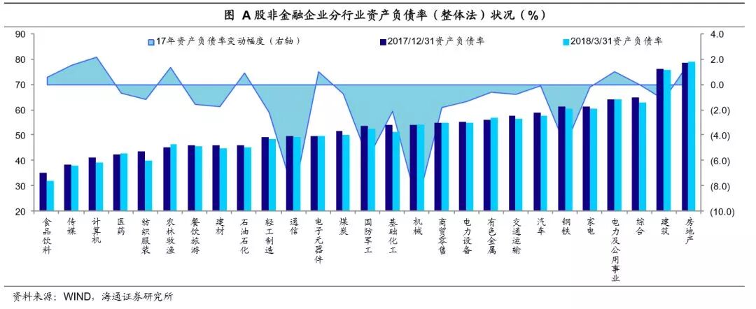 从杠杆率角度看,我们通过对上市公司17年年报数据的分析,发现17年底非金融企业杠杆率仍旧处于高位,行业中房地产、建筑、综合行业的杠杆最高(建筑和综合行业中有不少城投公司),本应是去杠杆的重点对象,但其整体资产负债率较16年底并没有改善,依旧是高杠杆模式。