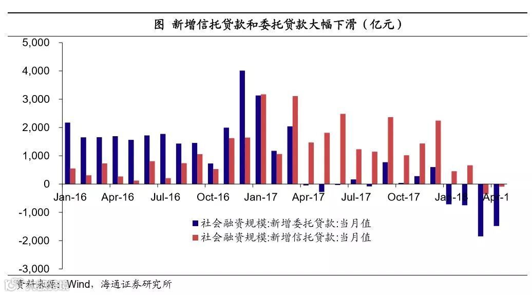 一是影子银行萎缩,今年以来影子银行监管趋严,银信合作新规、委贷新规从供给端压缩,资管新规从需求端限制,非标持续萎缩,今年1-4月信托+委托贷款合计少增1.9万亿。