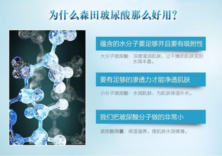我们在快节奏的生活中,不良作息、不良饮食习惯、热水澡以及季节变化等各种日常生活环境因素都会导致皮肤水分慢慢流失,日常补水也只是瞬息渐逝,只有持久保湿锁水才是保持皮肤水嫩美白的关键。而森田面膜结合蕴含水分子的玻尿酸,能够深度滋润肌肤,保湿滋养,让干燥的肌肤变得水润丰盈,嫩滑Q弹。
