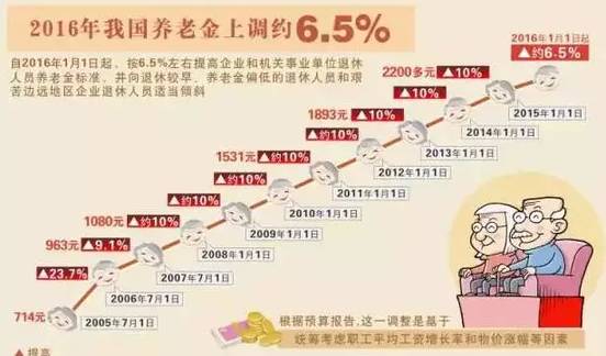 人社部、财政部今年4月份印发《关于2016 年调整退休人员基本养老金的通知》,从2016年1月1日起,为2015年底前已按规定办理退休手续并按月领取基本养老金的企业和机关事业单位退休人员提 高基本养老金水平,总体调整水平为2015年退休人员月人均基本养老金的6.5%左右。