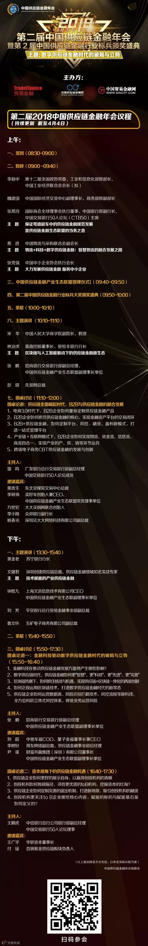 风口需要众多企业勇敢探索、追逐,中国供应链金融产业生态联盟为大家搭建平台,让企业能借势东风,更快介入供应链金融蓝海。2018年4月24日,第二届中国供应链金融年会即将在北京召开。在这里,传统产业、电商平台、保理公司、互联网金融企业等近百名企业大咖纷纷献计献策,共话金融科技驱动数字供应链时代的破局与立势,就技术赋能的产业供应链金融、区块链与人工智能驱动下的供应链金融新生态、B2B与供应链金融的融合发展,资本视角下的供应链金融机遇等问题展开讨论。让我们共同期待,他们将为供应链金融带来哪些“新”论。
