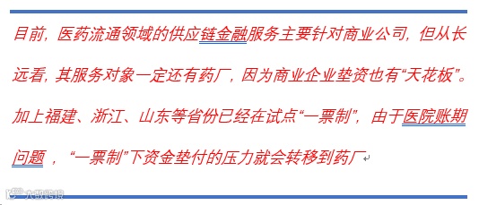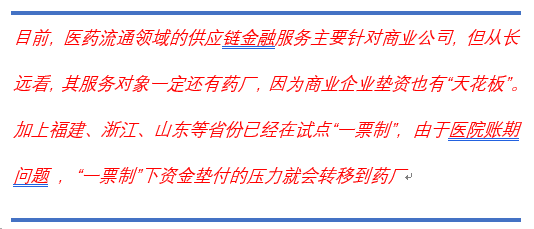 目前来看,医药流通领域的供应链金融服务主要为商业公司服务,但是从长远看,其服务对象一定还有药厂,因为医院地位强势,商业企业垫资也有天花板,必将波及工业企业。“两票制”下,医药流通供应链的环节虽然减少了,税务更合规了,但是由医院账期、税费等造成的成本、资金压力问题并没有得到根本解决,反而压力还在增加,只是让医药产业链的资金压力都集中在流通环节,进而也催生了医药流通供应链金融的万亿市场。