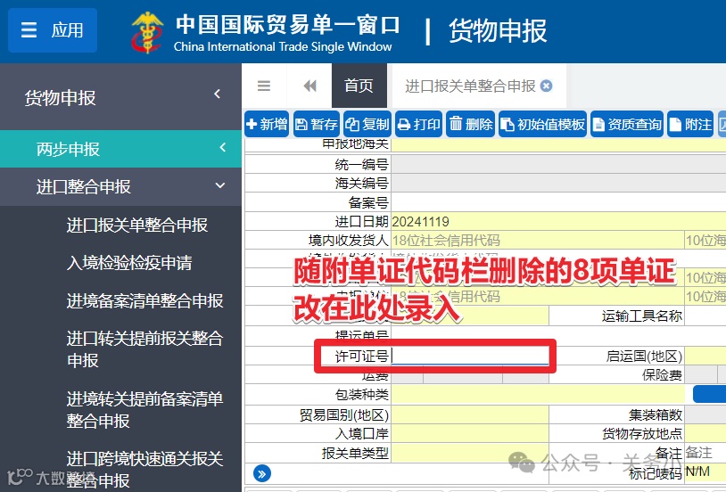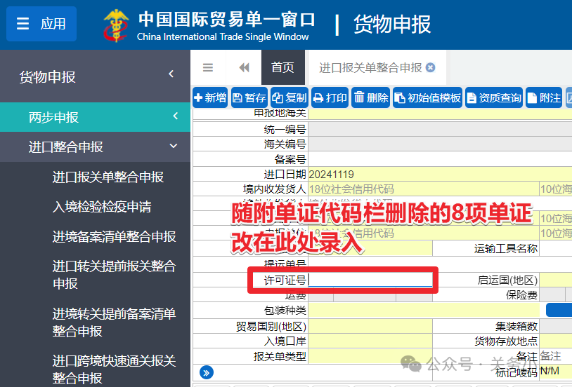 补充调整背景:根据中华人民共和国海关进出口货物报关单填制规范(在实施版)第十六条和第三十一条之规定,上述8类许可证应填报至“许可证号”栏。但不少企业在日常申报时常常误将上述单证填在了随附单证代码栏内,导致海关系统逻辑校验退单,进而再次修改报关单,对通关时效有一定影响。本次调整系同步对应填制规范,也更便利企业明确企业端界面的申报操作。