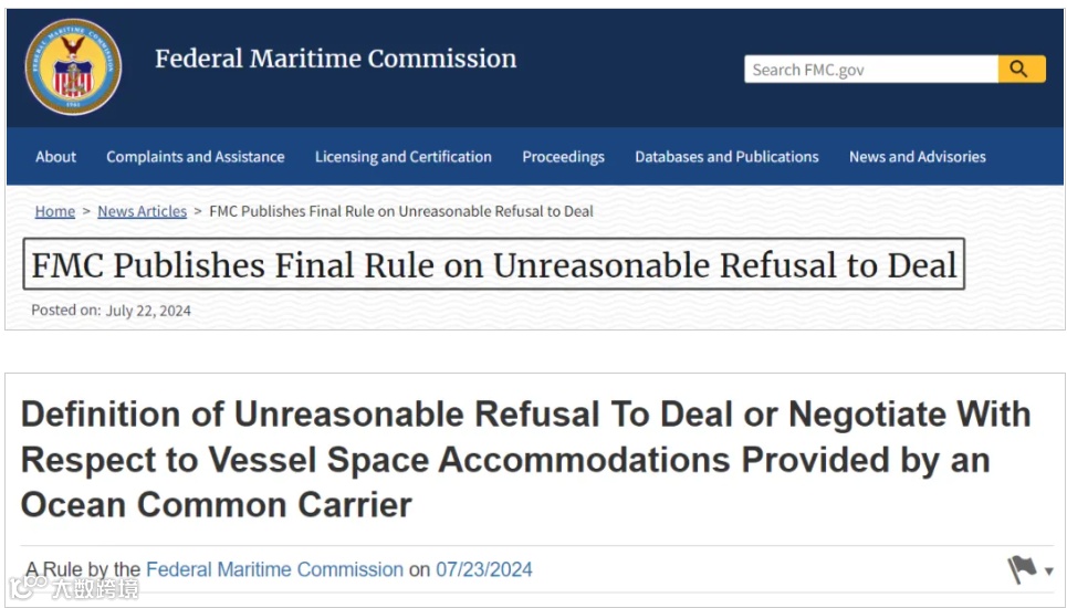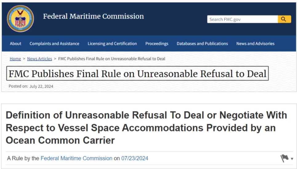 7月22日,美国联邦海事委员会(FMC)正式对外公布了其旨在规范集装箱班轮公司行为的重要新规——“Definition of Unreasonable Refusal to Deal or Negotiate with Respect to Vessel Space Accommodations Provided by an Ocean Common Carrier”,该新规是美国联邦海事委员会(FMC)依据2022年《海洋航运改革法案》制定的最终规则--Final rule