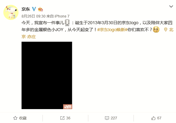 8 月 26 日 9:30,京东官微发布了一条消息,「诞生于 2013 年 3月 30 日的京东 logo,以及陪伴大家四年多的金属银色小 JOY,从今天起变了」!