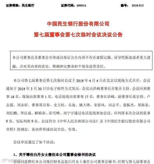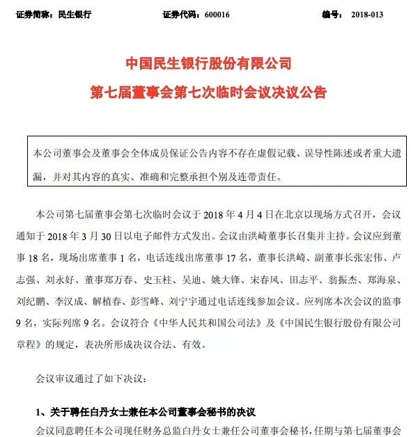 (1)原董秘方舟因个人原因辞去董秘和联席公司秘书职务,民生银行聘任公司现任财务总监白丹兼任公司董秘。白丹自2000年加入民生银行。