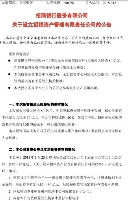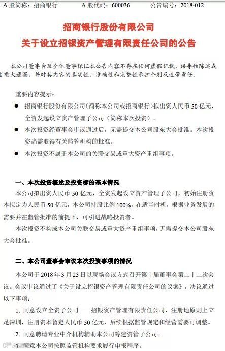 3月23日晚间,招商银行发布设立招银资产管理有限责任公司公告。据悉,招商银行拟出资50亿元,全资发起设立资产管理子公司,公司持股比例100%,在适当时机,根据业务发展的需要并在监管批准的前提下,可引进战略投资者。目前该项决议已经董事会通过。