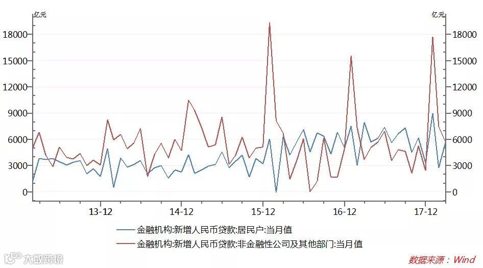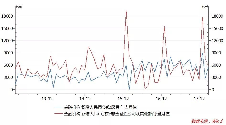 贷款又分为对公贷款和零售贷款,如下图,2016年以前,金融机构新增人民币贷款中,对公贷款(红线)总是遥遥领先零售贷款(蓝色);2016年以来,除年初的两个月外,零售贷款(蓝色)新增已经实现对对公贷款(红色)的反超。所以,贷款的增长,零售贷款是功臣。