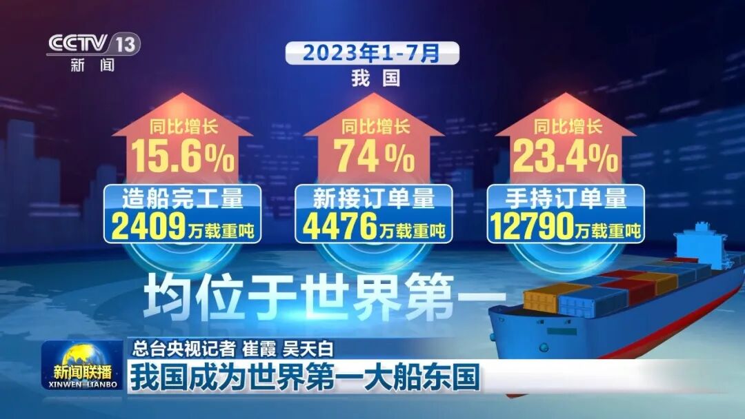 2023年1—7月,我国造船完工量2409万载重吨,同比增长15.6%;新接订单量4476万载重吨,同比增长74%;手持订单量12790万载重吨,同比增长23.4%。