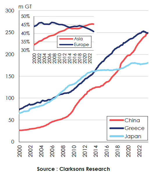 同时,中国船东所持有的船队规模达到2.492亿总吨,首次超越希腊成为世界最大船东国。