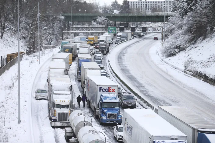 极端天气造成大量航班延误,再加之路面结冰导致车祸增多,车流无法前行,